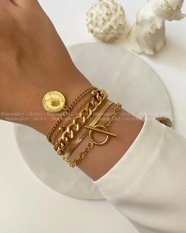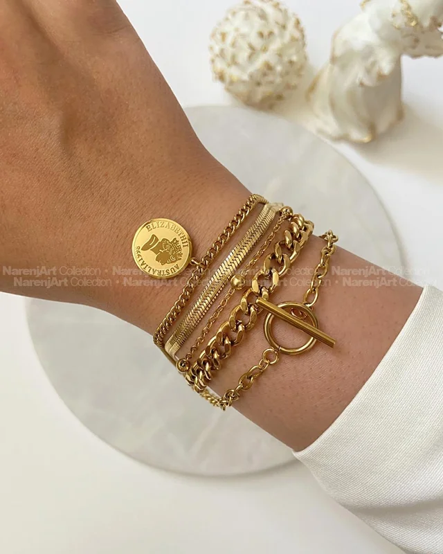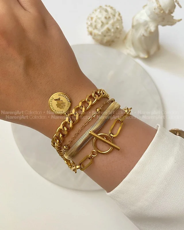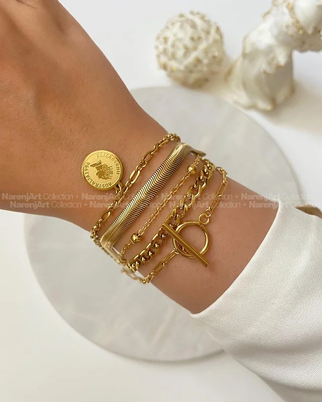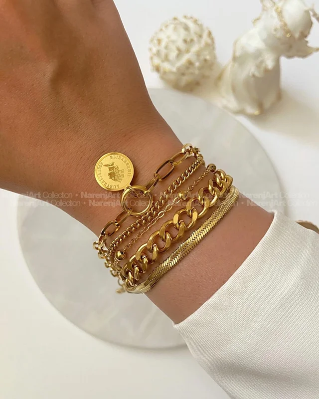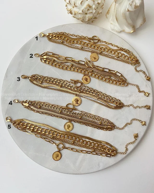 این دستبندهای چندرج الیزابت ترند جذابمون بالاترین کیفیت استیل طلایی هستن که آبکاری طلا شدن و ضدحساسیتن. کوتینگشون هایکوالیتیه و رنگ ثابتن که برای استفاده دائمی حتی در شرایط مرطوب عالین. قیمت و موجودیشونو میتونین برحسب اعداد مندرج در عکس دوم چک کنین.