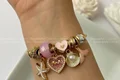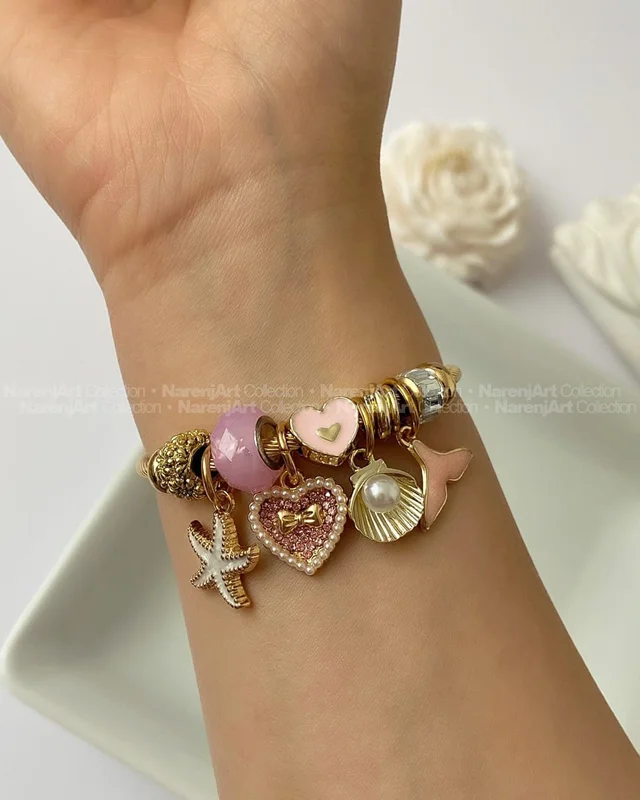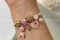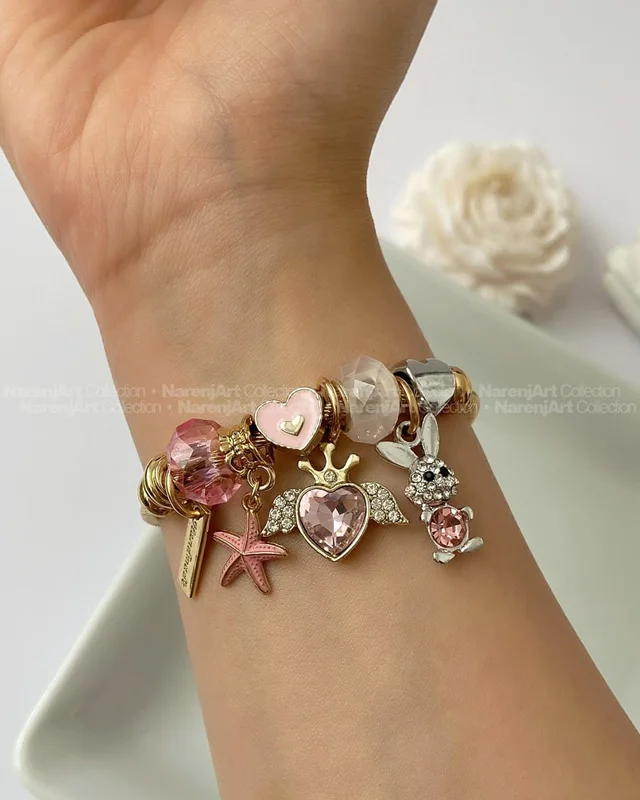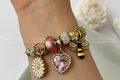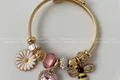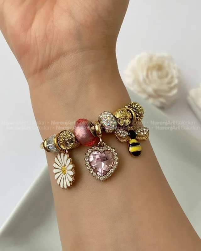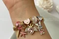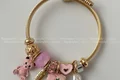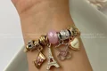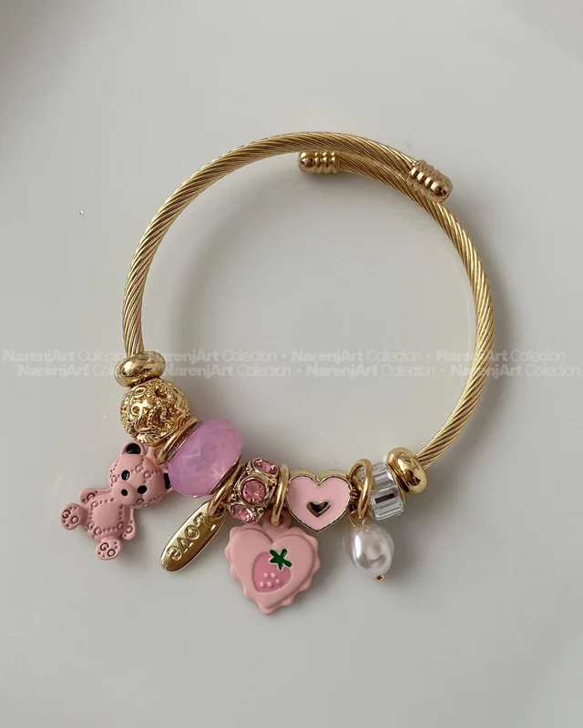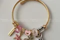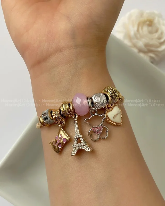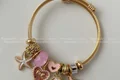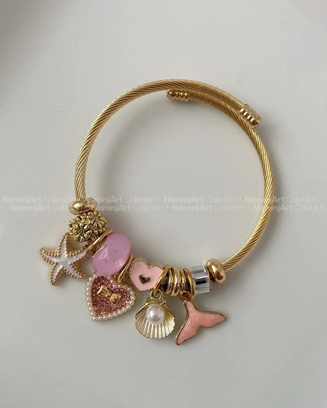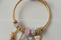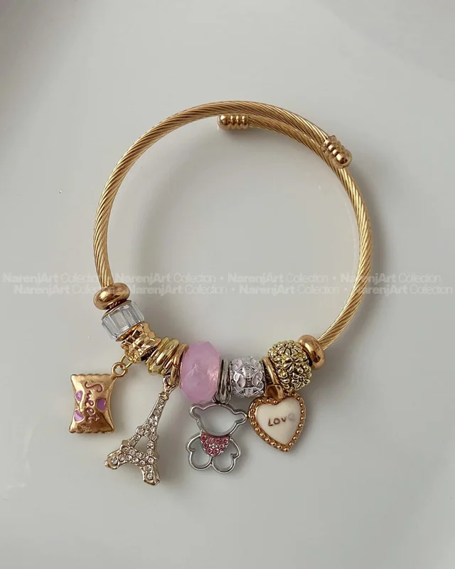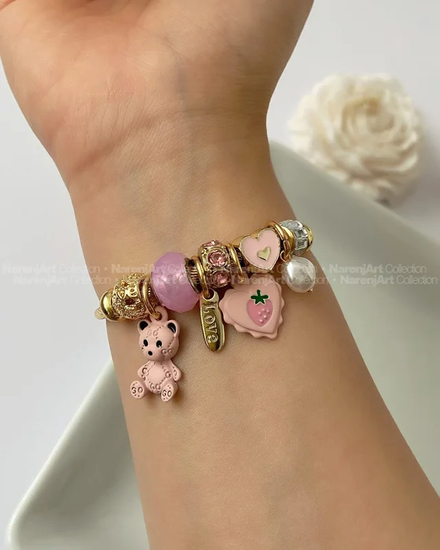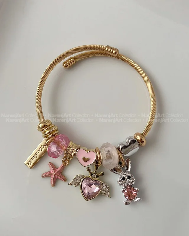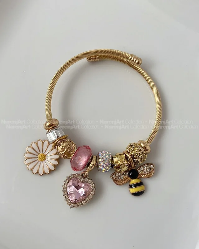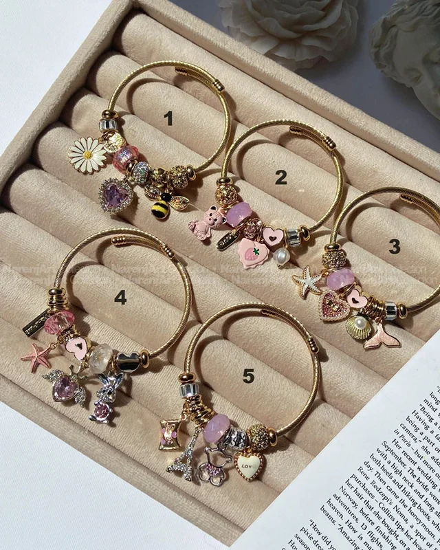 این دستبندا یا (بنگل)های جدید و ترند پاندورا پایه استیل طلایین که آنتیباکتریال و ضدحساسیتن. چارمها یا (آویز)هاشون کوپرن که آبکاری شدن. پایهشون که استیله در برابر رطوبت رنگ ثابت دائمیه و آویزاشون اگه زیاد در معرض شویندهها نباشن ثبات رنگشون میتونه طولانی مدت باشه. فریسایزن که برای هرسایز مچ قابل تنظیمن. نگیناشونم که عالی کار شدن و نگینریزی ندارن. موجودی هر مدل رو هم میتونین برحسب اعداد مندرج در عکس دوم چک کنین.