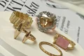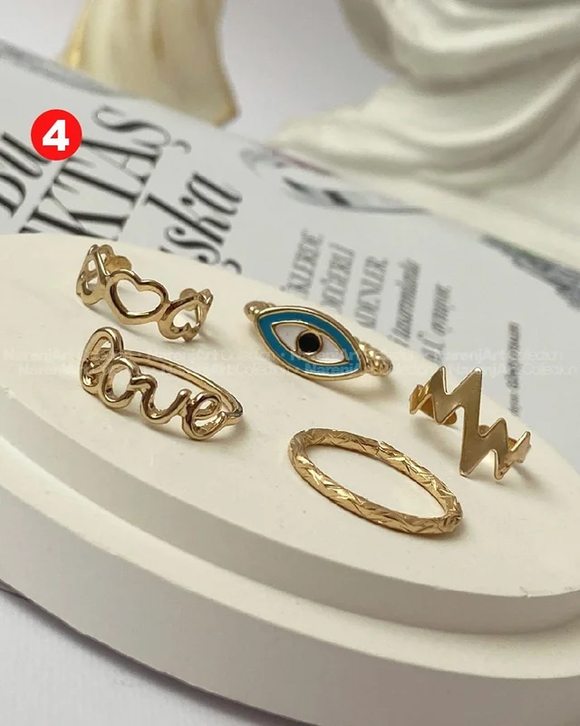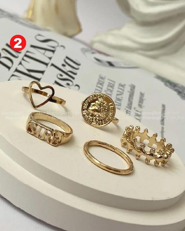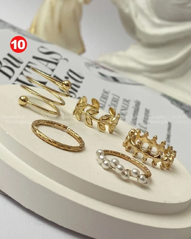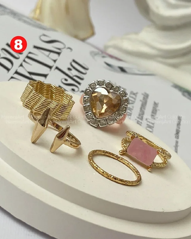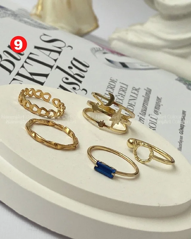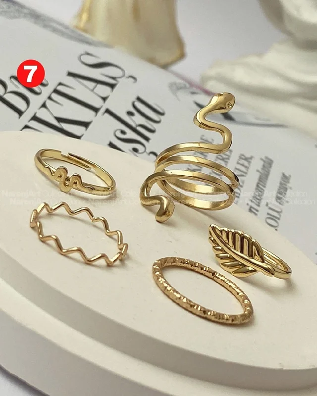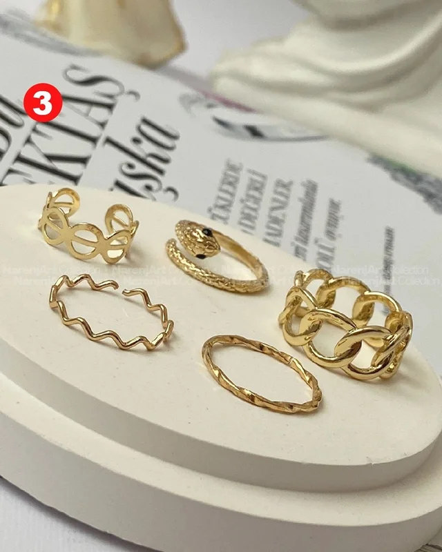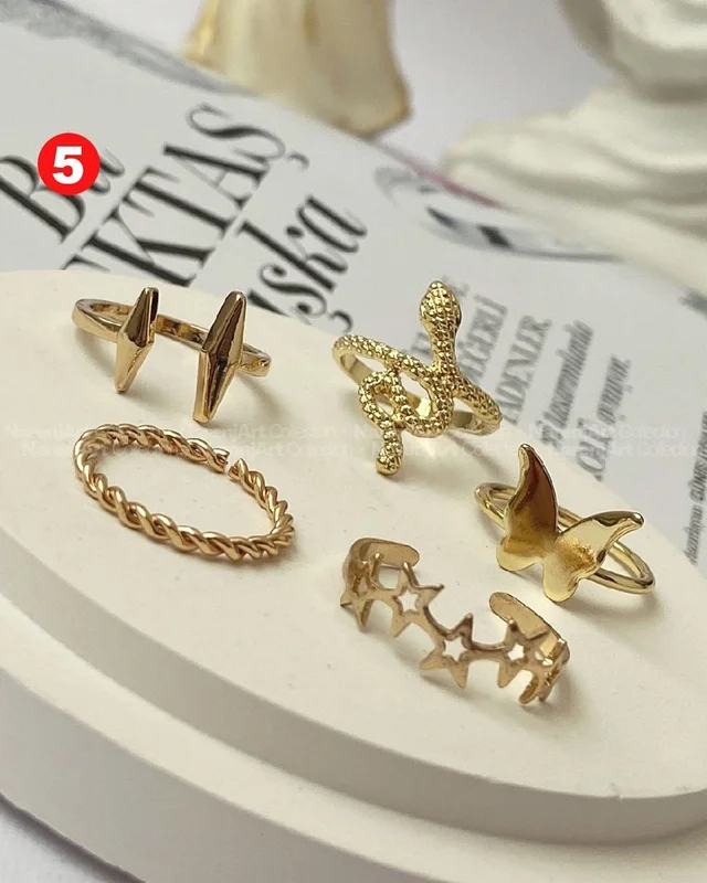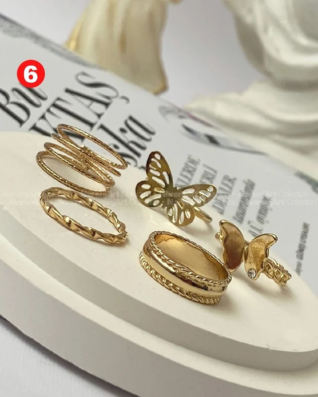 این ستهای انگشتر طلایی کوپر هستن که آبکاری شدن و ضدحساسیتن. جزو کارای مراقبتی هستن و بهتره در معرض الکل یا شویندهها نباشن. در هر پک بصورت میکس سایزای ۶-۷-۸ موجودن و بعضی مدلاشم فریسایزن که برا سایزای ۹ یا ۱۰ هم قابل تنظیمن. مدلای مختلف برحسب کدهای درج شده روی هرعکس قابل انتخابن و عکس اول کد یک هست.