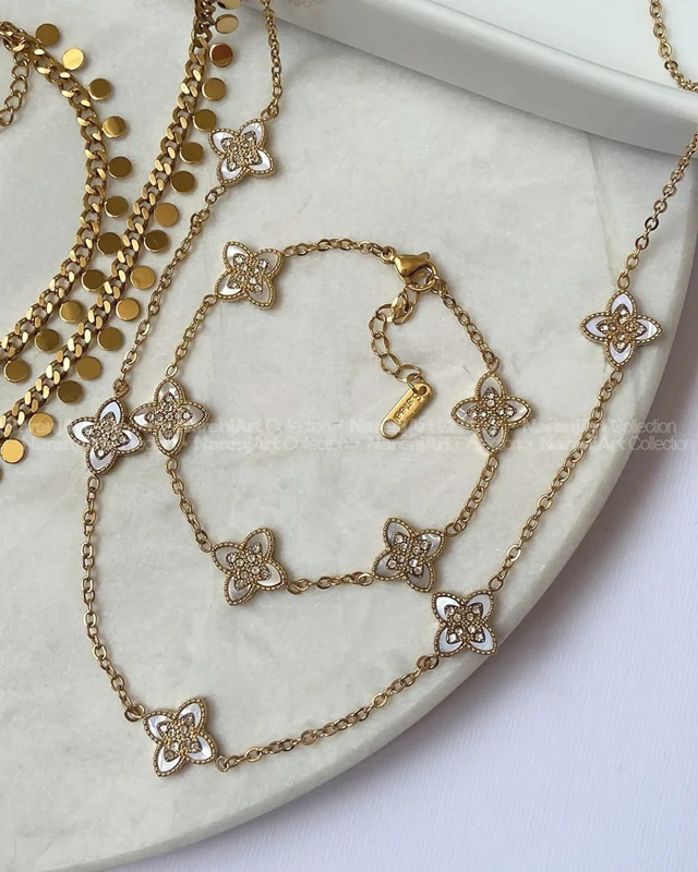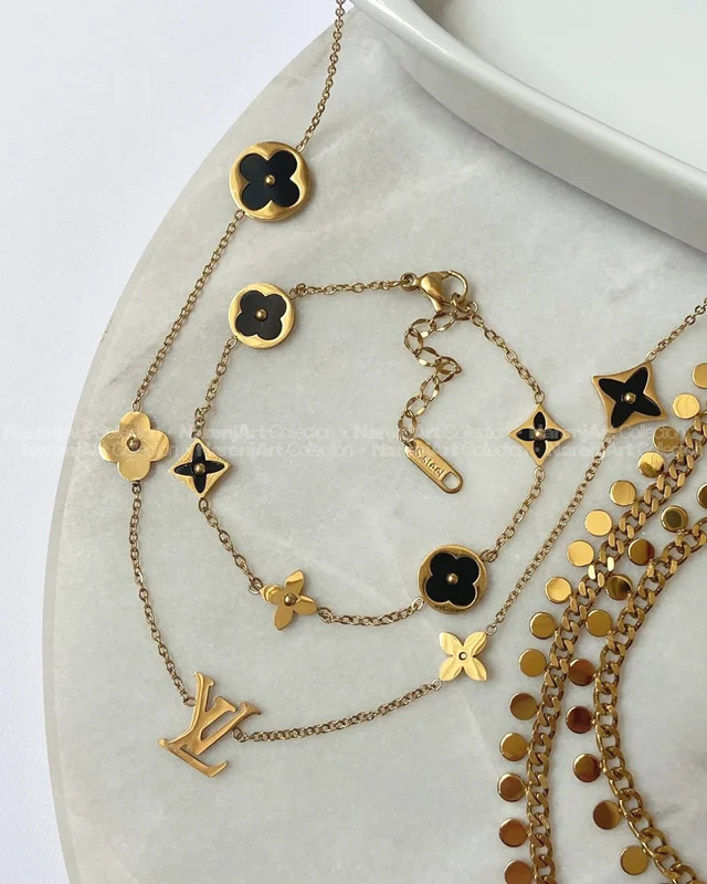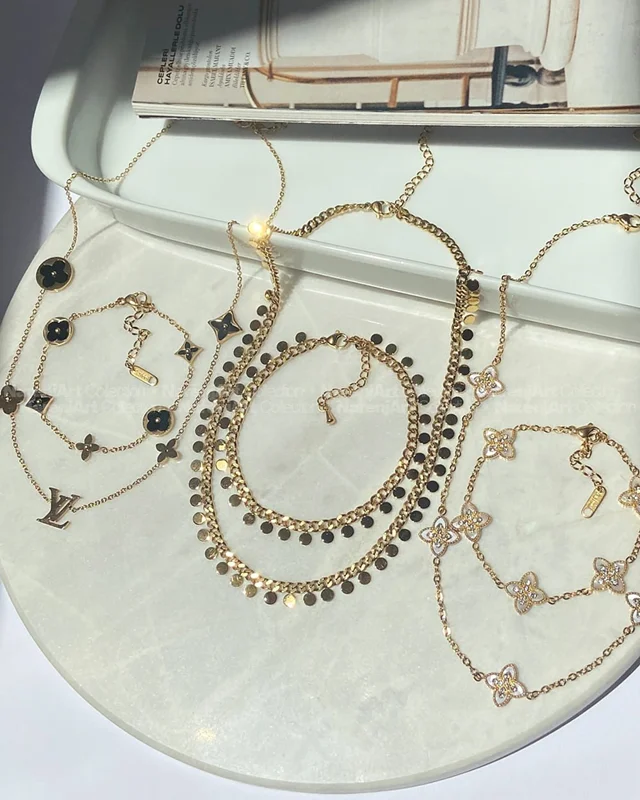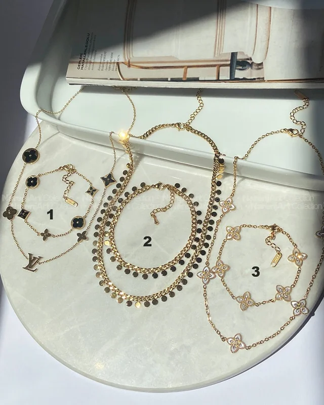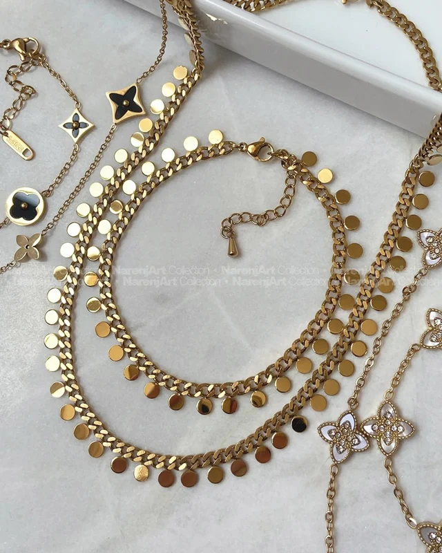 این نیمستهای جدید ترندمون بالاترین کیفیت استیل طلایی هستن که هایکوالیتی آبکاری طلا شدن و ضدحساسیتن. رنگ ثابتن که برای استفاده مداوم روزانه حتی در شرایط مرطوب یا هوای شرجی عالین. این نیمستها بصورت گردنبند و دستبند باهم تقدیمتون میشن. مدلاشون رو میتونین برحسب اعداد مندرج در دومین عکسشون چک و انتخاب کنین.
