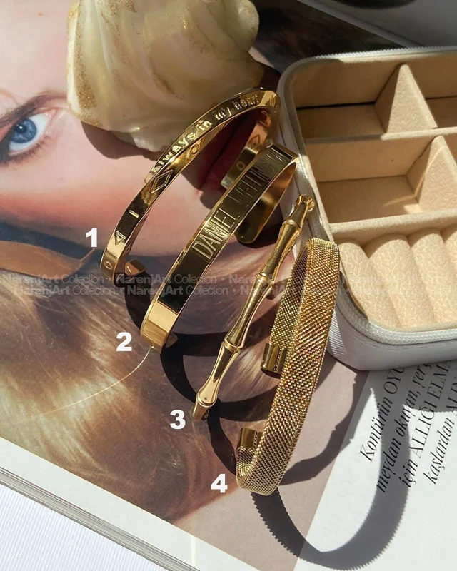 این بنگلهای جدید و ترندمون بالاترین کیفیت استیل طلایی هستن که هایکوالیتی آبکاری طلا شدن و ضدحساسین. کاملا رنگثابتن که برای استفاده مداوم روزانه حتی در شرایط مرطوب یا هوای شرجی بهترین گزینهن. فریسایزن که برای سایزای مختلف قابل تنظیمن. موجودی مدلاشون رو میتونین برحسب اعداد مندرج در دومین عکسشون چک و انتخاب کنین.