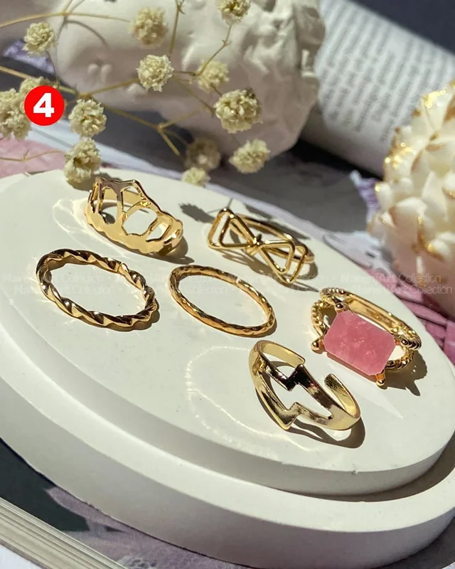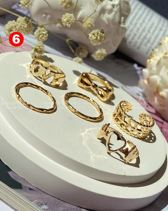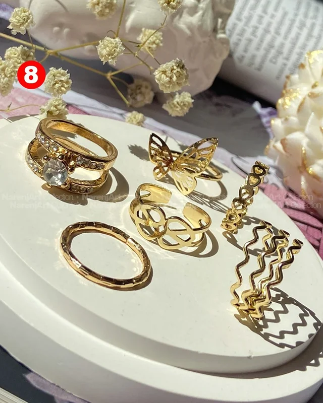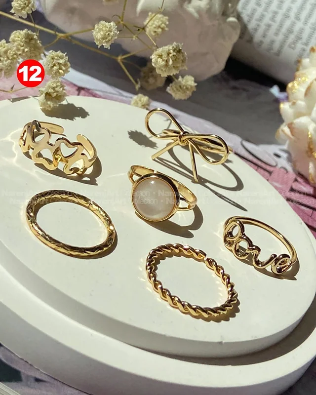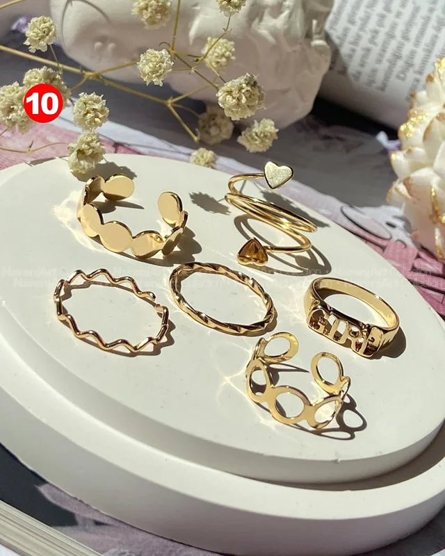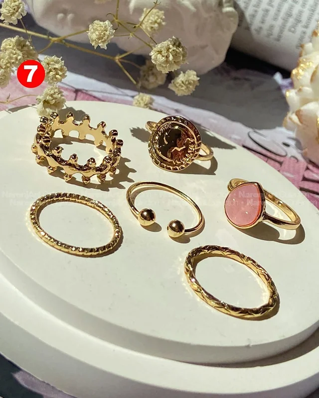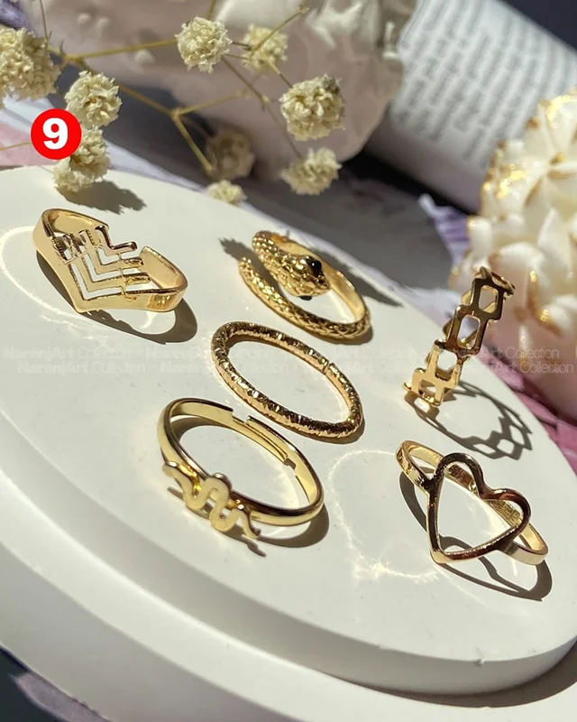 این ستهای انگشتر طلایی کوپر هستن که آبکاری شدن و ضدحساسیتن. جزو کارای مراقبتی هستن و بهتره در معرض الکل یا شویندهها نباشن. در هر پک بصورت میکس سایزای ۶-۷-۸ موجودن و بعضی مدلاشم فریسایزن که برا سایزای ۹ یا ۱۰ هم قابل تنظیمن. مدلای مختلف برحسب کدهای درج شده روی هرعکس قابل انتخابن و عکس اول کد یک هست.