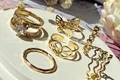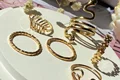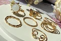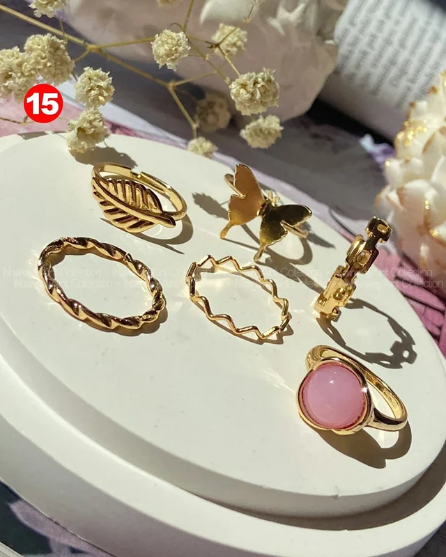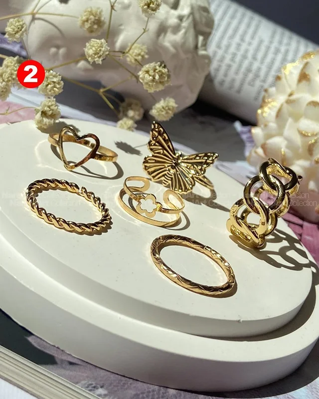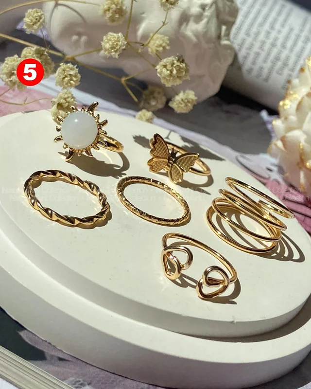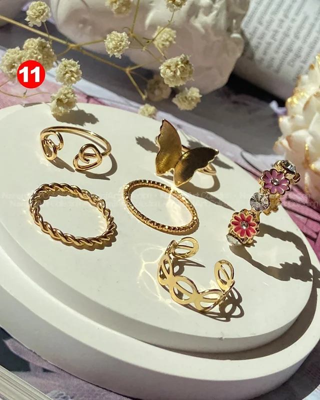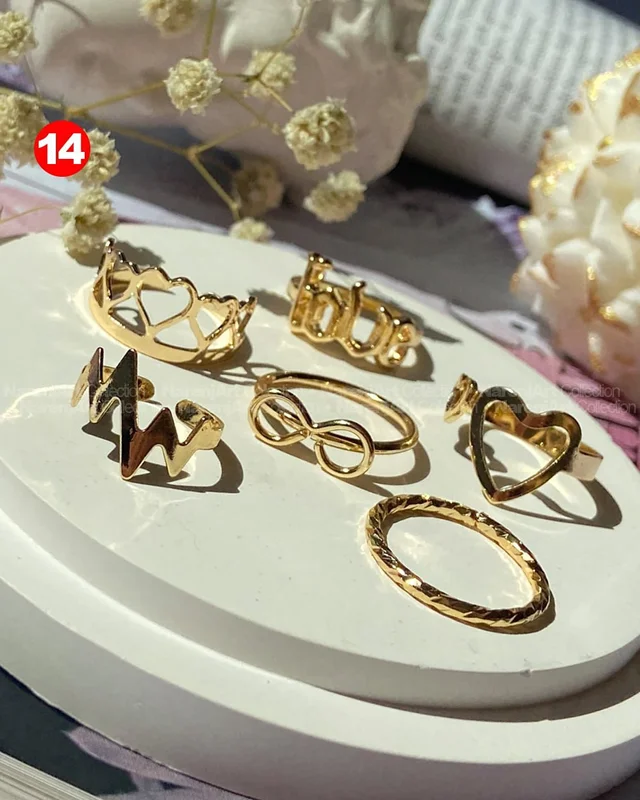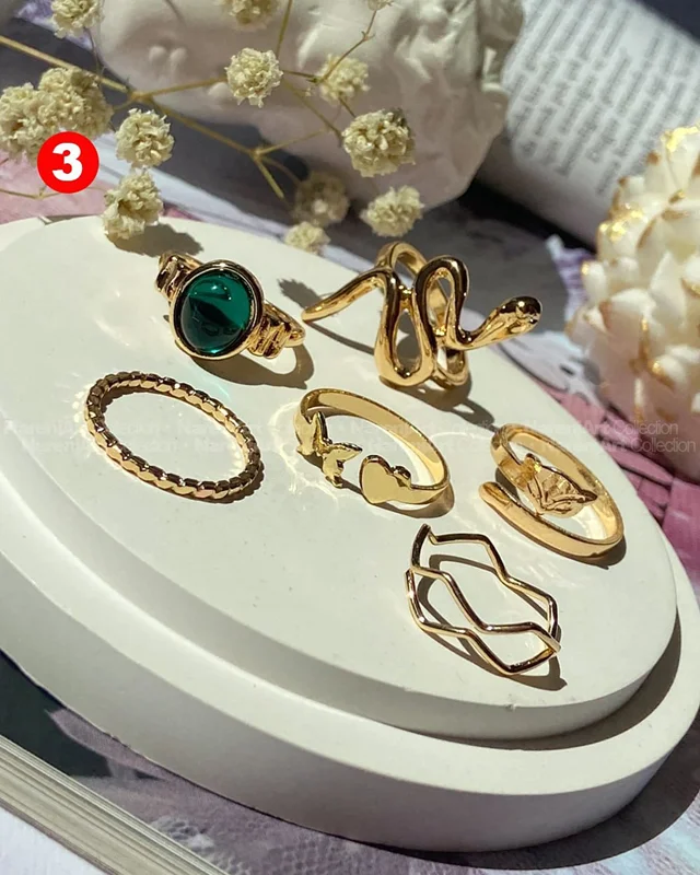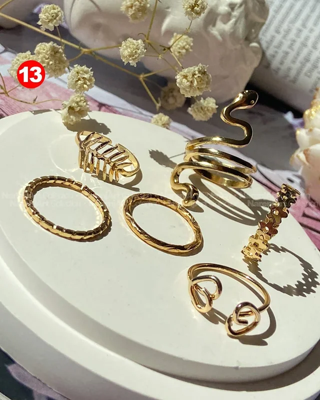 این ستهای انگشتر طلایی کوپر هستن که آبکاری شدن و ضدحساسیتن. جزو کارای مراقبتی هستن و بهتره در معرض الکل یا شویندهها نباشن. در هر پک بصورت میکس سایزای ۶-۷-۸ موجودن و بعضی مدلاشم فریسایزن که برا سایزای ۹ یا ۱۰ هم قابل تنظیمن. مدلای مختلف برحسب کدهای درج شده روی هرعکس قابل انتخابن و عکس اول کد یک هست.