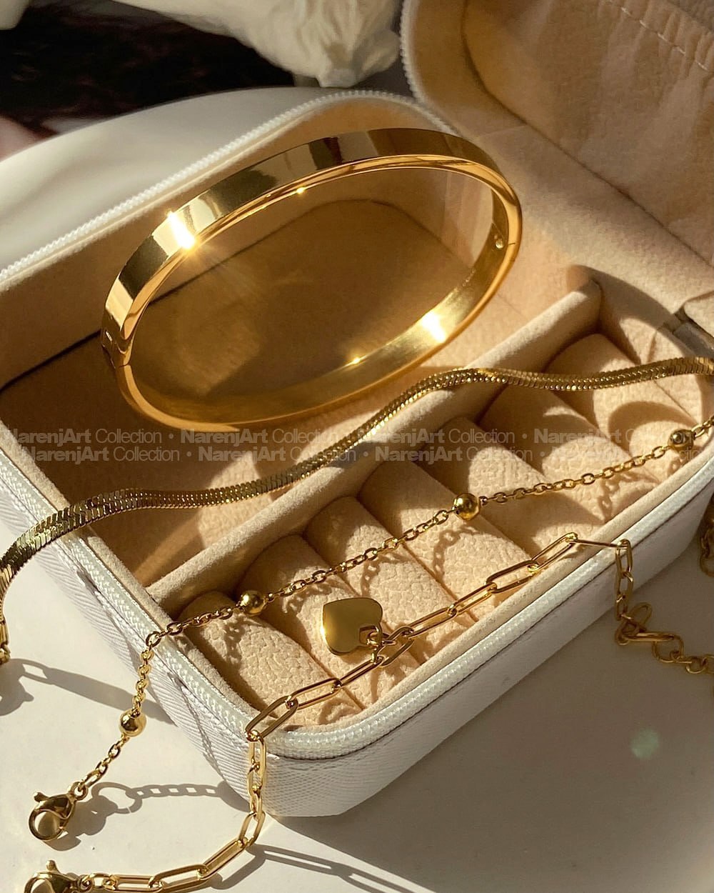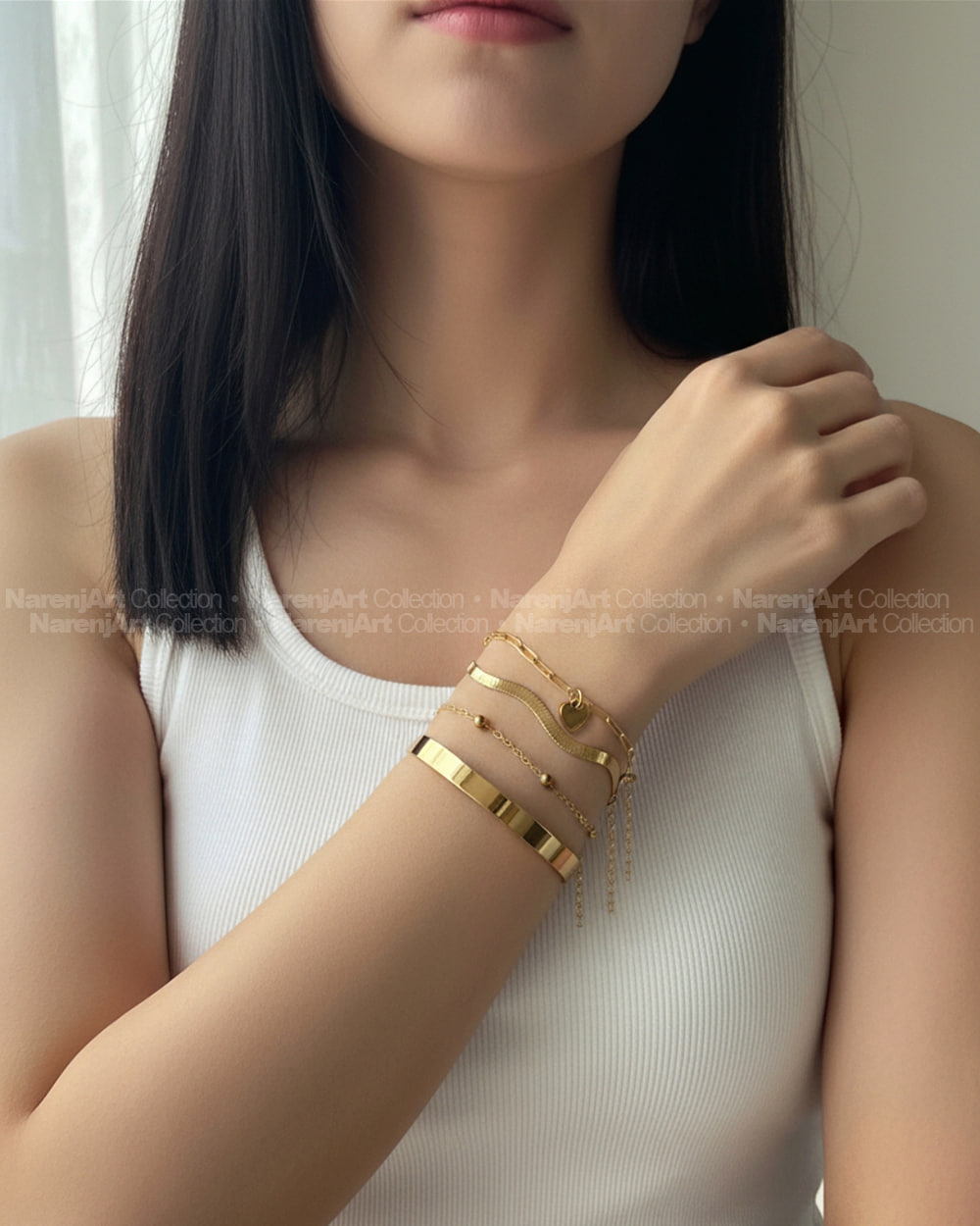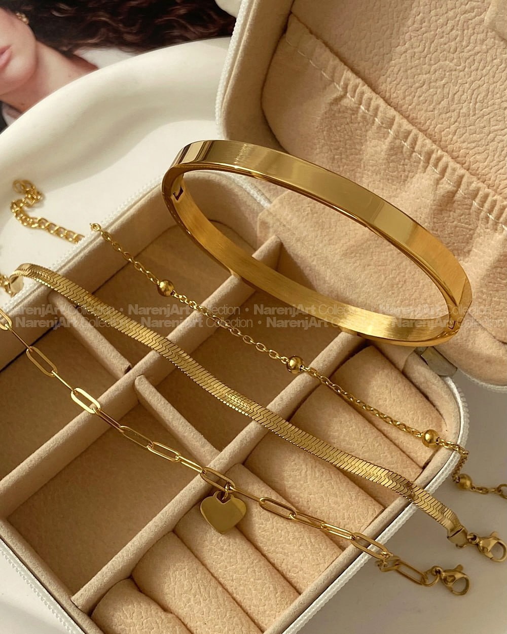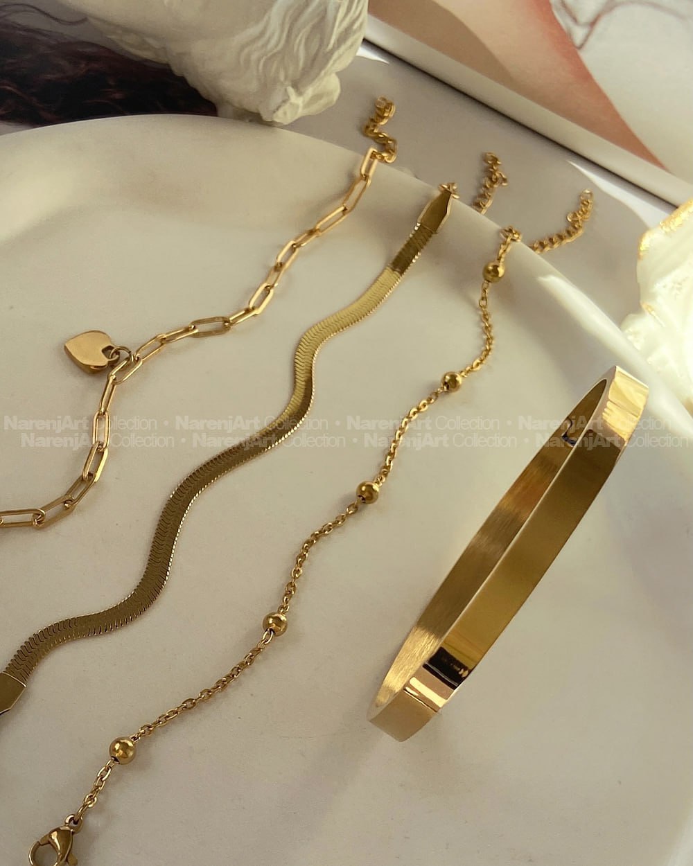 این پک دستبند و بنگل جدید و ترند چهارتیکهمون بالاترین کیفیت استیل طلاییه که هایکوالیتی آبکاری طلا شدن و ضدحساسیتن. کاملا رنگثابتن که برای استفاده مداوم روزانه حتی در شرایط مرطوب یا هوای شرجی مناسبن. دستبندها متصل نیستن که هم بعنوان ست و هم تکی قابل استفادهن. هر ۴ دستبند باهم و بصورت ست تقدیمتون میشن.