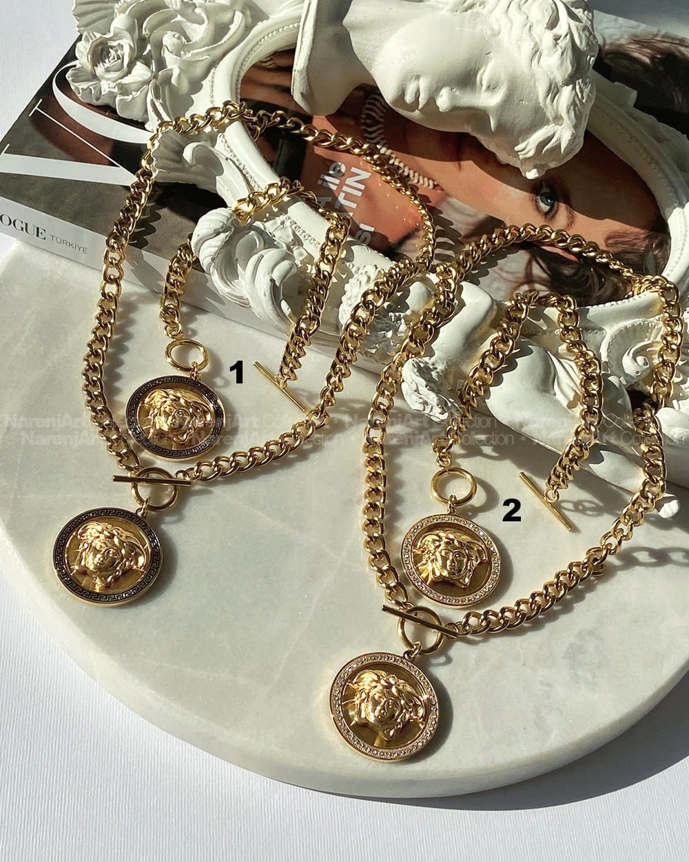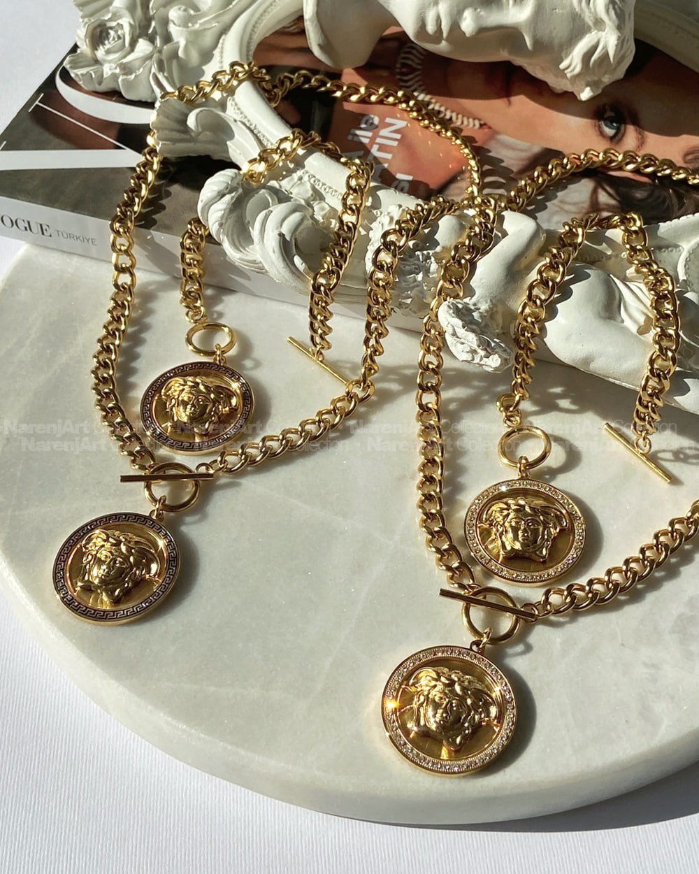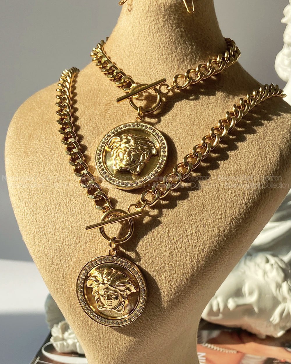 این نیمستهای ورساچه ترند جذابمون بالاترین کیفیت استیل طلایی هستن که آبکاری طلا شدن و ضدحساسیتن. کوتینگشون هایکوالیتیه و رنگ ثابتن که برای استفاده دائمی حتی در شرایط مرطوب عالین. نیمستها بصورت گردنبند و دستبند باهم قابل سفارشن. طول گردنبندها ۴۵س و دستبندها برای دورمچ ۱۵ تا ۱۸س مناسبن. موجودیشون رو میتونین برحسب اعداد مندرج در عکس دوم چک کنین.